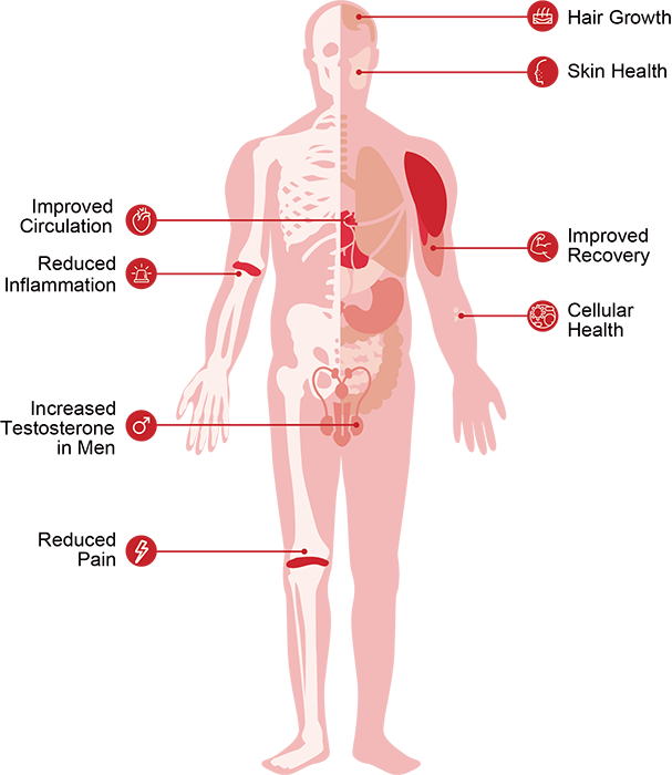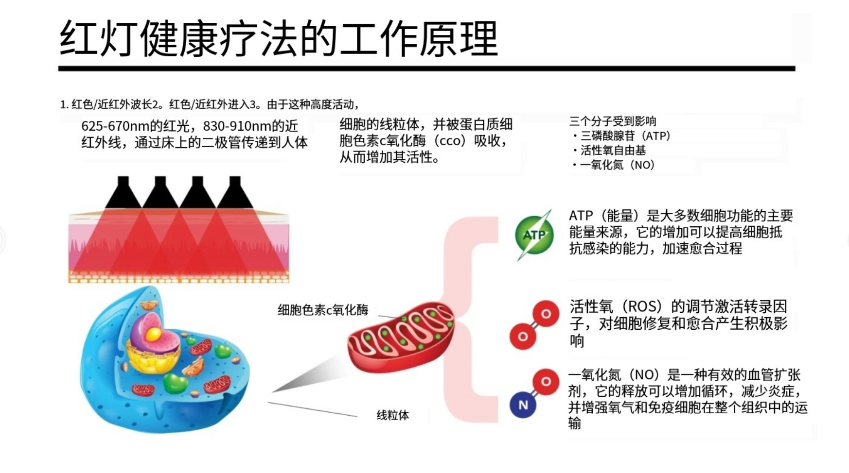 当您将整个身体暴露在红光和近红外光下时,细胞中称为线粒体或细胞“发电站”的部分会吸收它并产生更多能量,也称为 ATP(三磷酸腺苷)。 通过使用红光健康增强线粒体功能,细胞可以产生更多 ATP。 有了更多的能量,细胞就能更有效地发挥作用、自我恢复活力并修复损伤。