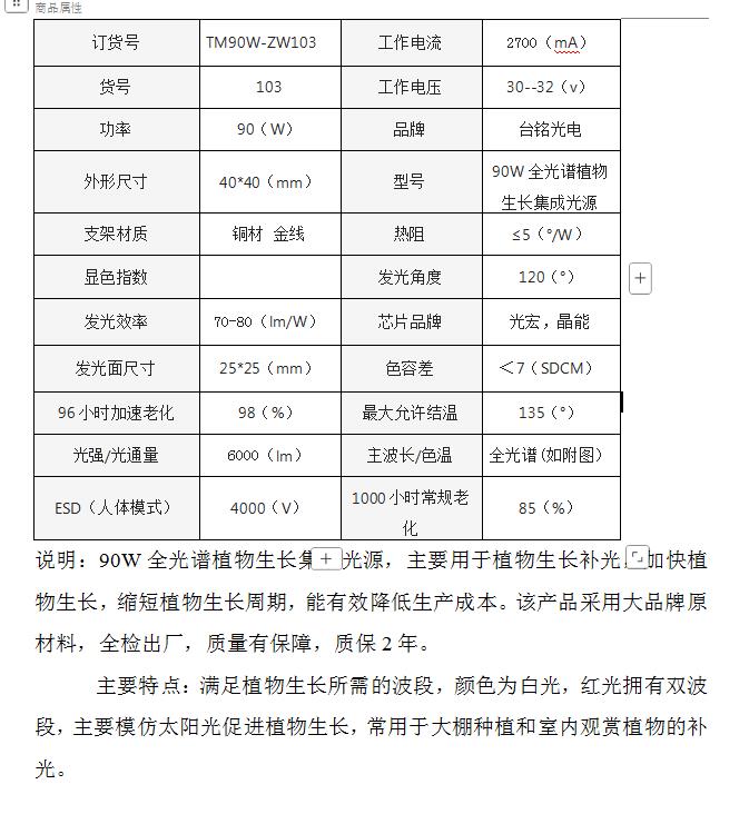 说明:90W全光谱植物生长集成光源,主要用于植物生长补光,加快植物生长,