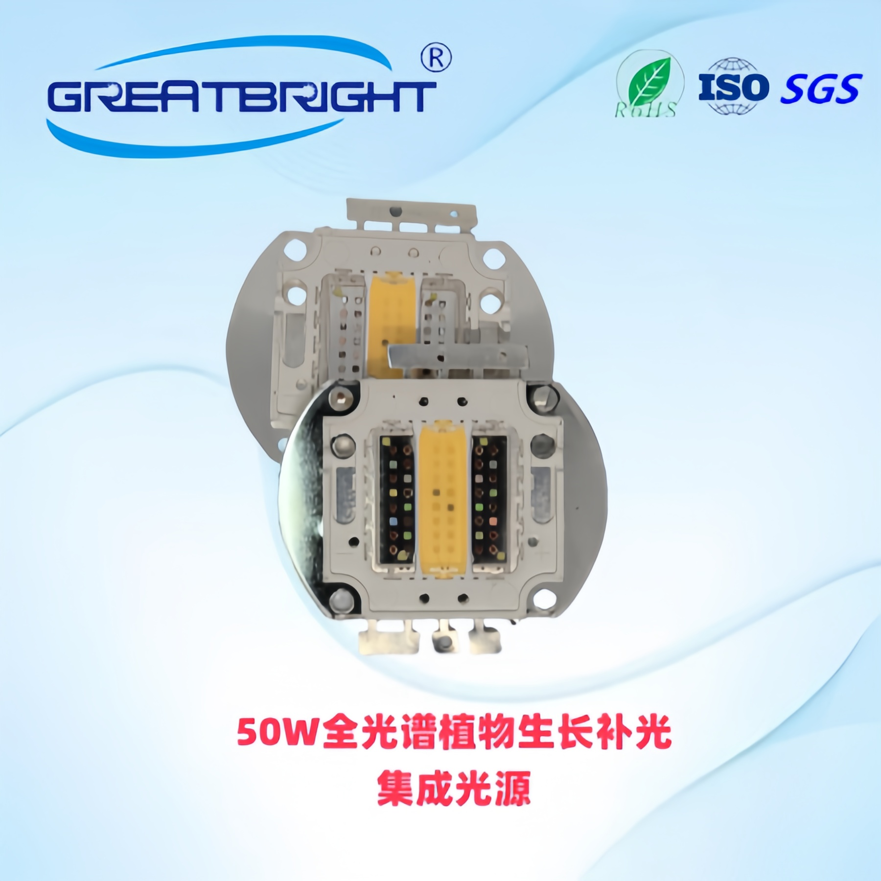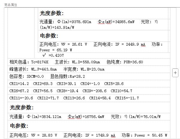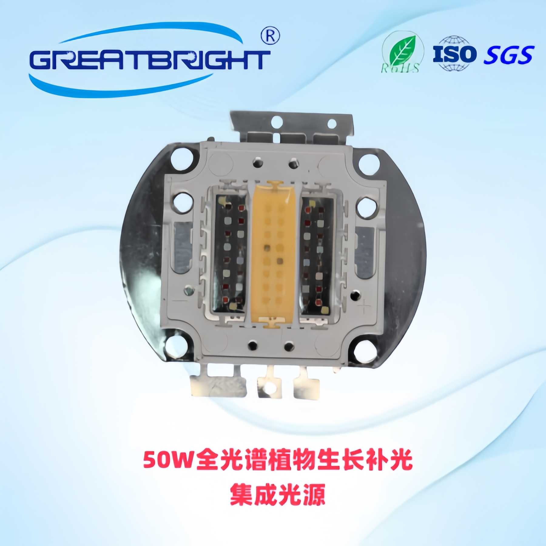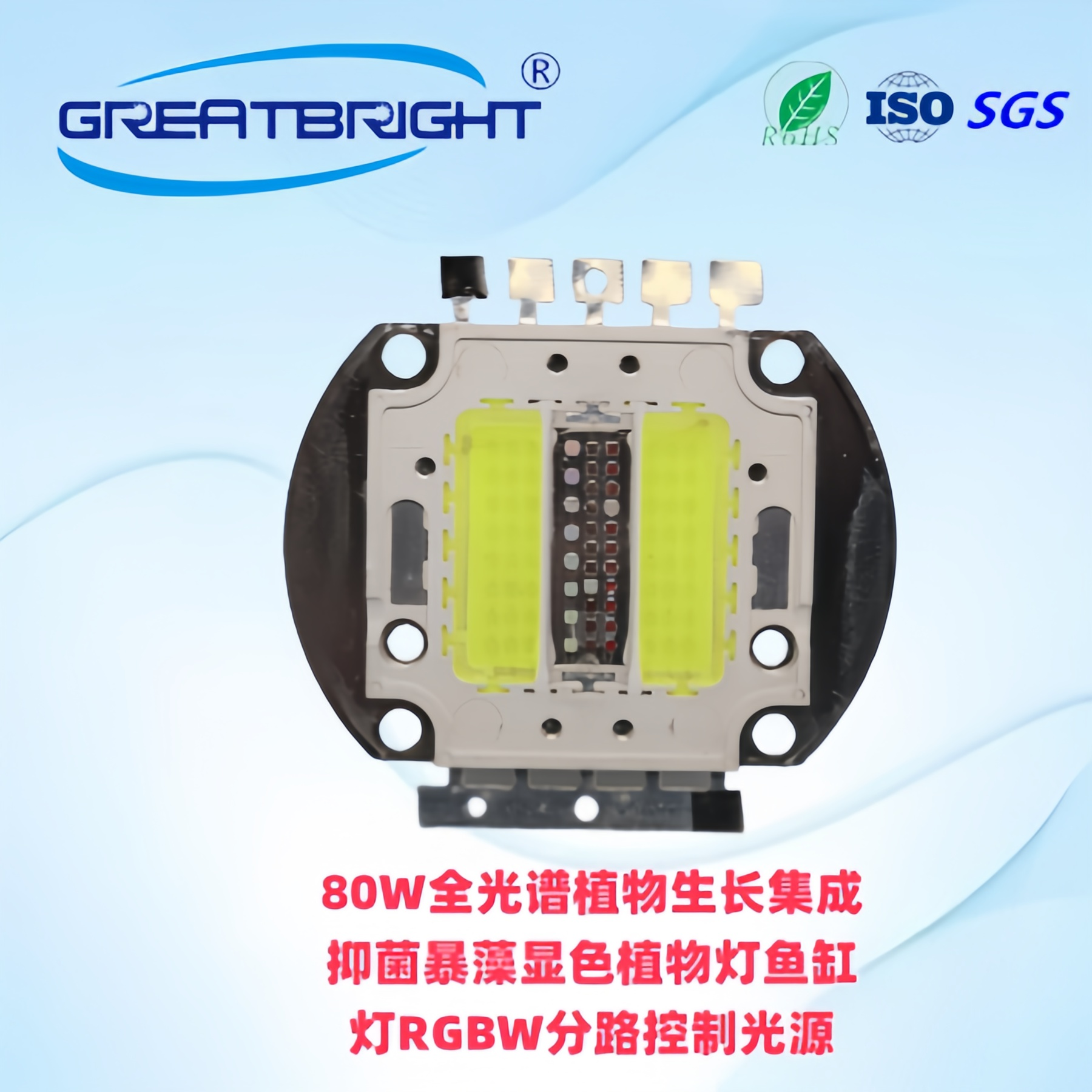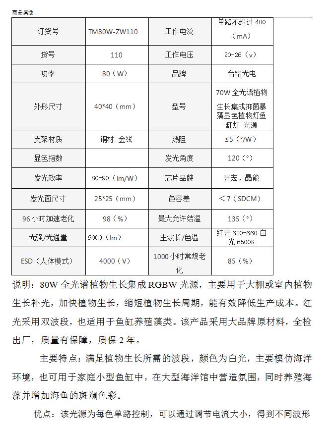 说明:80W全光谱植物生长集成RGBW光源,主要用于大棚或室内植物生长补光,
