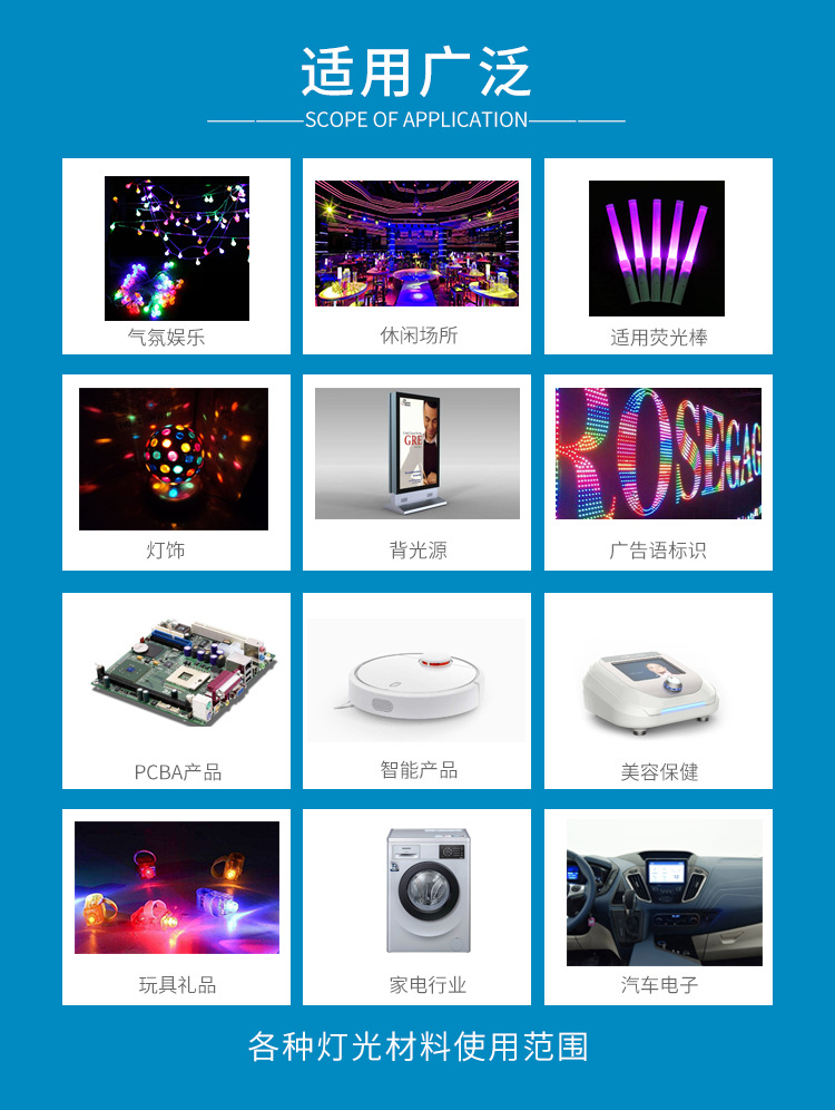 广泛应用于数码产品,家用电器,消费类电子产品,LCD背光,汽车电子,仪器仪表,工业设备,电子玩具。显示屏,户外装饰,工业照明等。