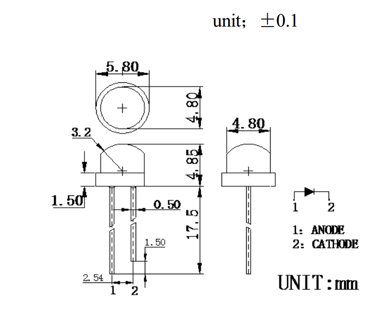 注:发光角度,功率,胶体颜色,波长940NM,850NM,均可按客户要求做货。红外线发射管(IR LED)也称红外线发射二极管,属于LED二极管类。它是可以将电能直接转换成近红外光(不可见光)并能辐射出去的发光器件,主要应用于各种光电开关、触摸屏及遥控发射电路中。红外线发射管的结构、原理与普通发光二极管相近,只是使用的半导体芯片材料不同。红外发光二极管通常使用砷化镓(GaAs)、砷铝化镓(GaAlAs)等材料,采用全透明或浅蓝色、黑色的光学级树脂封装。